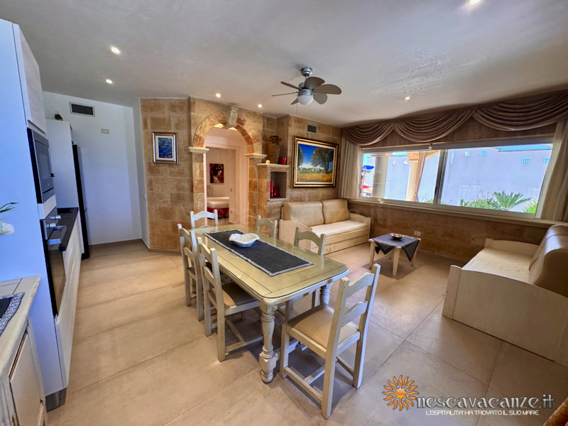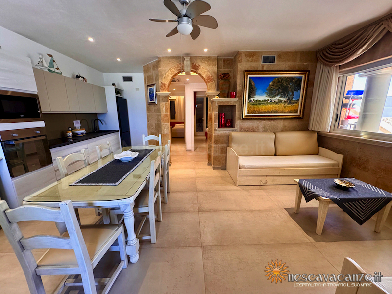 Casa vacanza pescoluse 1 è ubicata nel centro residenziale di Pescoluse a 350 metri dalla spiaggia dorata di sabbia finissima di questa splendida marina di Salve. Questa posizione garantisce ai nostri inquilini il soggiorno ottimale per godere delle acque cristalline delle "Maldive del Salento" e raggiungere le migliori attrazione turistiche di queste incantevoli terre, rendendo di fatto indimenticabili le loro vacanze nel salento. Questa casa che Nescavacanze vi propone è un appartamento trilocale che si erge su un piano rialzato, racchiusa da una veranda arredata con suppellettili da giardino: ideale per rilassarsi seduti nel salottino, presente in essa, semplicemente distesi a prendere il sole sullo sdraio scorgendo, nel frattempo, i diversi colori dell'incantevole mare di Pescoluse. Meravigliosa è, infatti, la vista mare che da questo appartamento si apre a chiunque varchi la porta d' ingresso, in pieno soggiorno, attraverso una grande finestra, creata proprio per permettere ai nostri clienti un continuo contatto con i bei paesaggi di queste terre e garantire loro delle piacevoli vacanze nel salento.