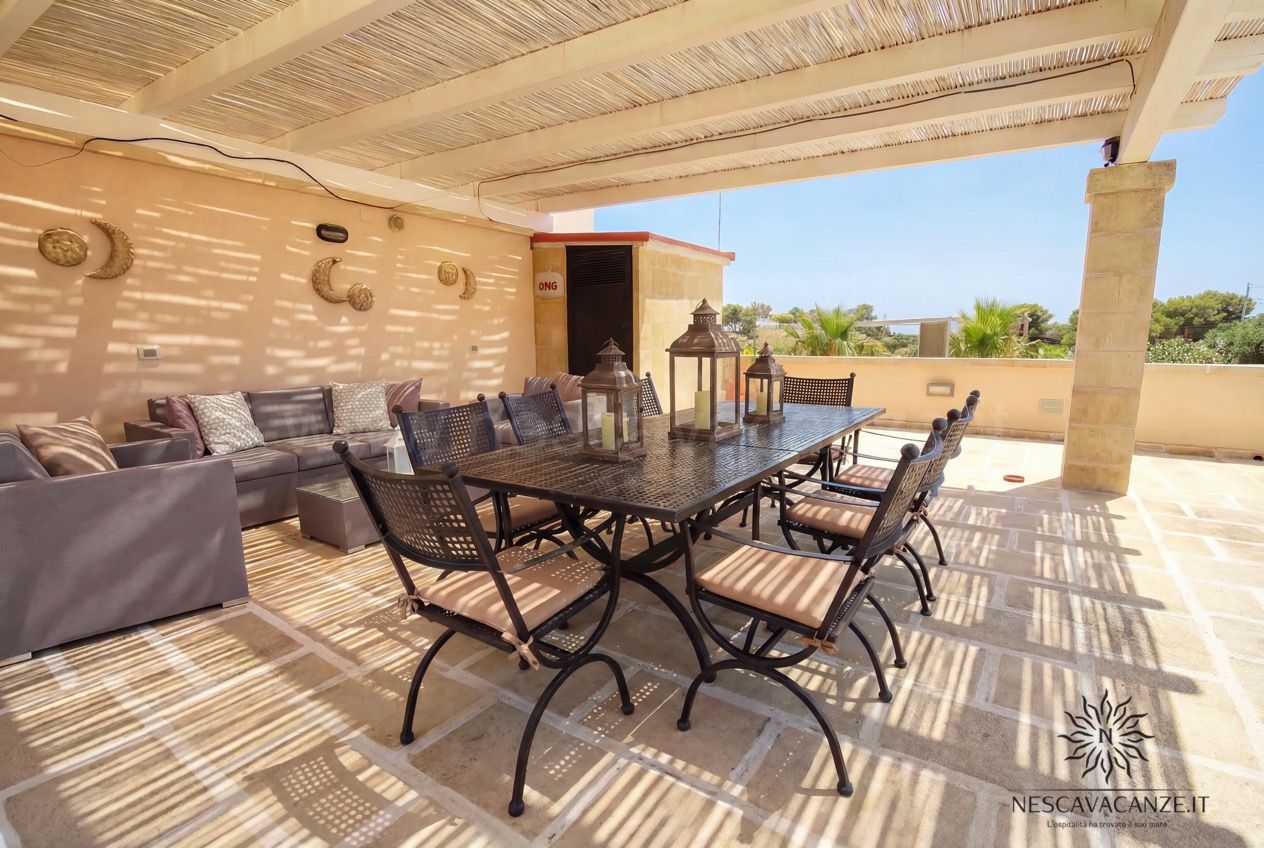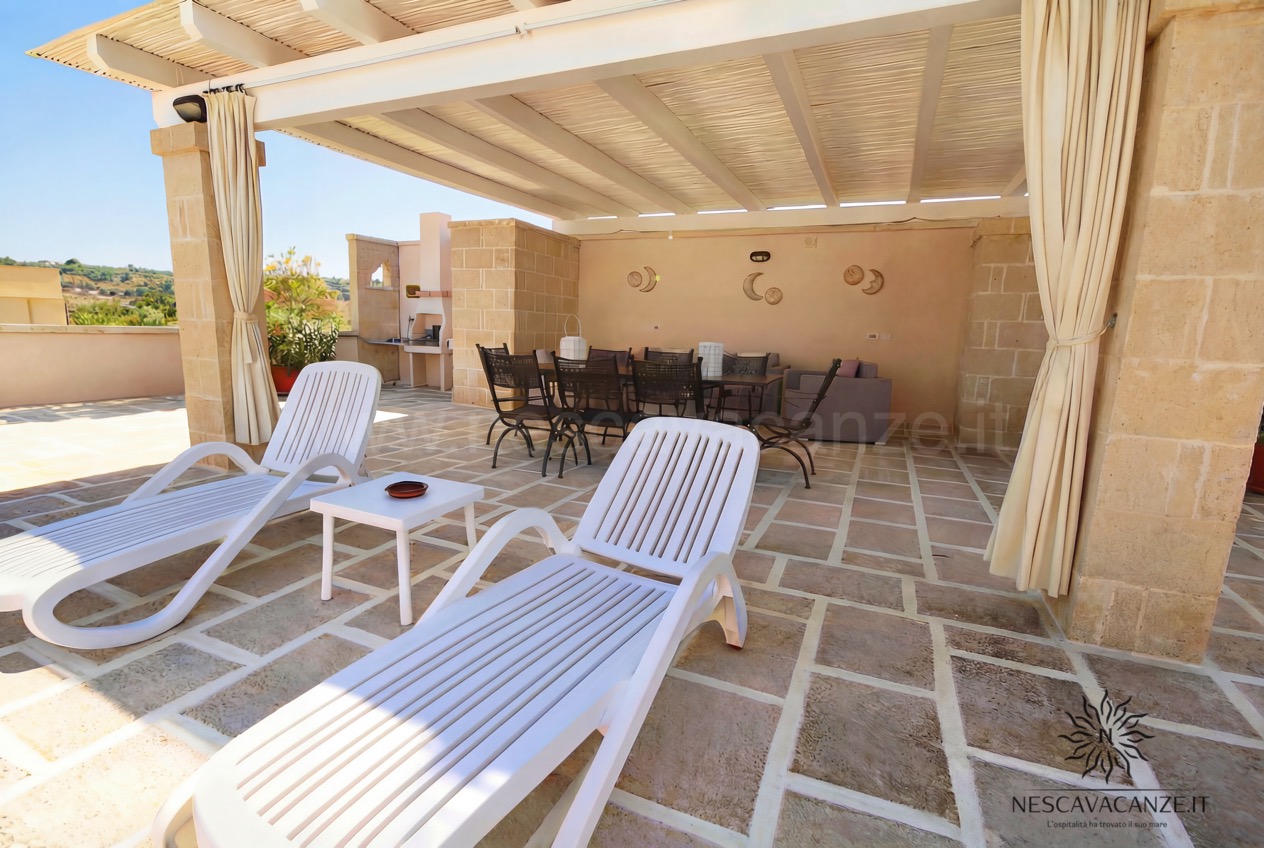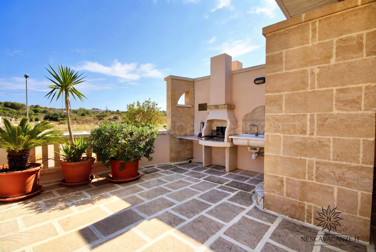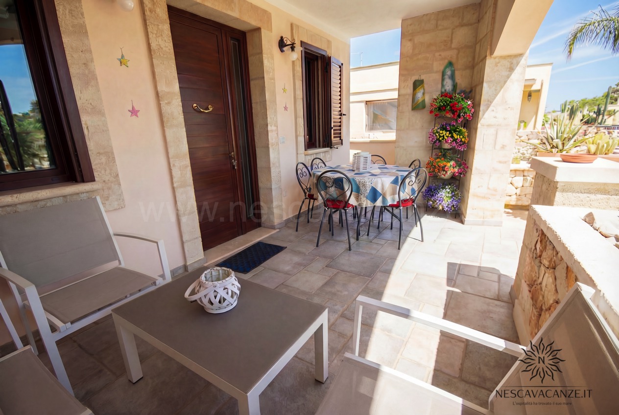 Questo appartamento a pescoluse è parte del complesso di via Beethoven sito a 400 metri dalla spiaggia finissima e dorata di Pescoluse. La struttura della quale fa parte questa bellissima casa vacanze in salento è situata nel centro residenziale del paese in zona tranquilla e accessibile ai servizi, quali market, tabacchi, cartoleria ecc.. La vostra esperienza presso casa vacanze Pescoluse 4 sarà sicuramente gratificante. Si tratta di un appartamento nel salento indipendente composto da una veranda arredata con mobili da giardino da cui si ha modo di entrare nel cuore della casa vacanze, laddove è presente un soggiorno con angolo cottura, una camera da letto matrimoniale, una camera da letto singola e un bagno. Rimarrete stupiti dagli arredamenti, dalle rifiniture in tufo leccese, dall'eleganza e dal comfort che Pescoluse 4 è in grado di offrirvi; e rimarrete ancor più gratificati dal suo splendido terrazzo: ampio tanto da permettervi momenti di svago o momenti di relax, tuffandovi nelle vista mare che questo ambiente vi offre. E' il massimo, da soli con la propria famiglia o in compagnia dei vostri amici, attrezzarsi di carne e griglia così sfruttando il barbecue qui presente, consumando poi il tutto sul tavolo del terrazzo: potete in questo modo passare nel modo migliore una rilassante serata delle vostre vacanze nel meraviglioso Salento.