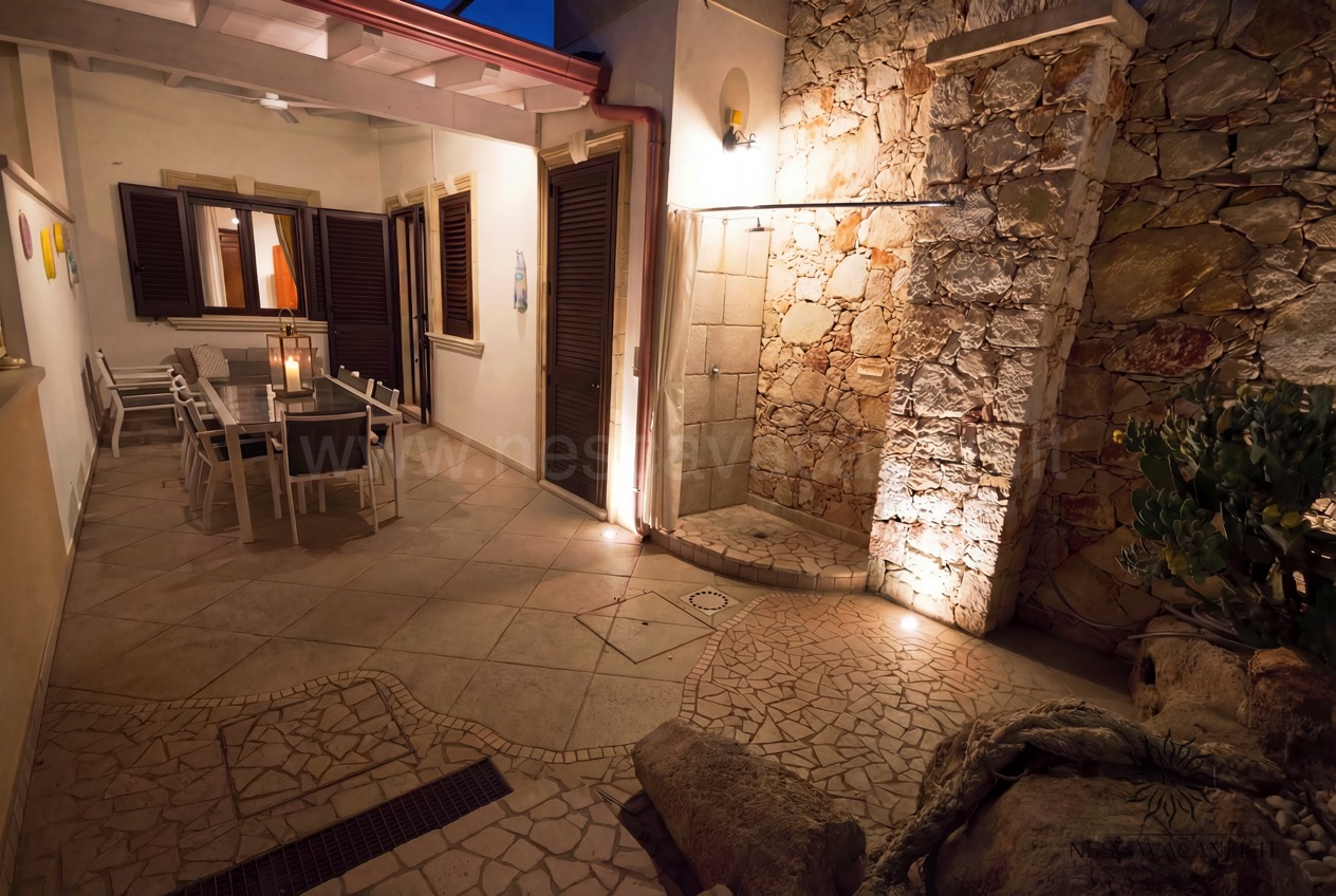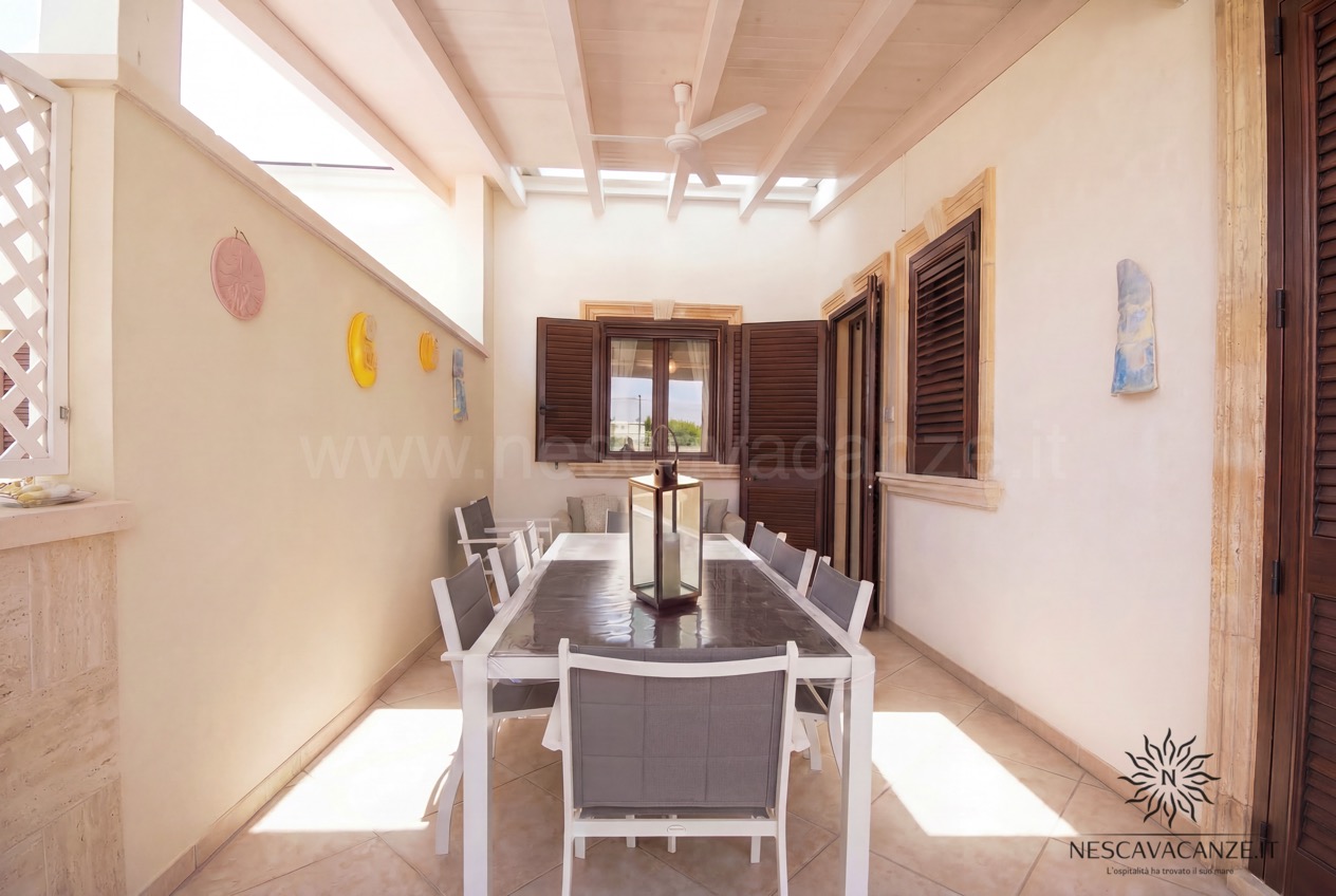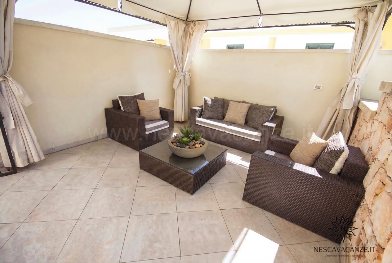 Quest'appartamento di vacanze in salento è un quadrilocale con 9 posti letto, del quale ciò che colpisce ancora una volta sono gli spazi esterni, in parte adiacenti a quelli riservat per casa pescoluse 8 e in parte posizionati in modo tale da essere riparati da tutto ciò che è circostante, grazie alla presenza di un grande gazebo, rivestito da tendaggi che coprono lo sguardo ad occhi indiscreti, potendo vivere momenti con se stessi in piena tranquillità . Inoltre la sua architettura rifinita con le pietre delle splendenti terre salentine è un piacere per gli occhi. E se già l'esterno colpisce, l'interno non è da meno: casa vacanze Pescoluse 9 è curato nei minimi dettagli; un ampio soggiorno con angolo cottura si apre all'ingresso dell'appartamento, progettato in modo tale da dare quella sensazione di accoglienza al visitatore, sin dai primi momenti. Vi sono poi due bagni e tre camere da letto, di cui due matrimoniali oltre che una terza con letti singoli. Il tutto è arricchito da quei servizi che noi di Nescavacanze cerchiamo di non far mancare: lavatrice, ventilatore a pale in tutte le stanze, impianto di condizionamento centralizzato in tutte le camere (aria fredda e aria calda), tv con ricevitore satellitare, asciugacapelli, barbecue a legna, zanzariera su tutti gli infissi, impianto di aspirazione centralizzato e doccia esterna con acqua fredda e acqua calda. Insomma, Casa vacanze Pescoluse 9 è la migliore soluzione che gruppi di famiglie o amici possano trovare, per vivere una splendida vacanza a pescoluse nel salento indimenticabile e irripetibile.